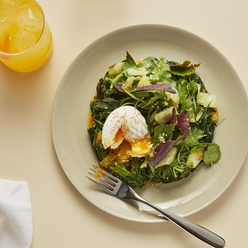 このメニューの特別さは、オーストラリアの多文化的アイデンティティを祝福している点にあります。一皿一皿がそれぞれ独自のストーリーを語ります。たとえば、「菊菜とグリーンキムチのパンケーキ」は、ベトナムのバインセオや韓国のパンケーキから着想を得ながら、日本の季節の菊菜を引き立てています。また、「ビルズプレート」には、蒜山酪農のゴーダチーズ、シソオイルのラブネ、シード入りライ麦クラッカーなど、地域の食材をふんだんに使用。地域ごとの多様性を巧みに反映した、ユニークな一皿となっています。