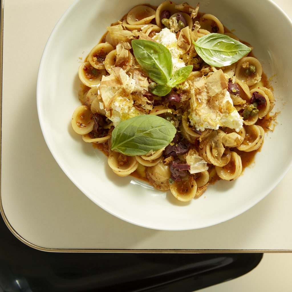 しいたけXOソースのオレキエッテ リコッタ、ケーパー、カラマタオリーブ、鰹パン粉添え