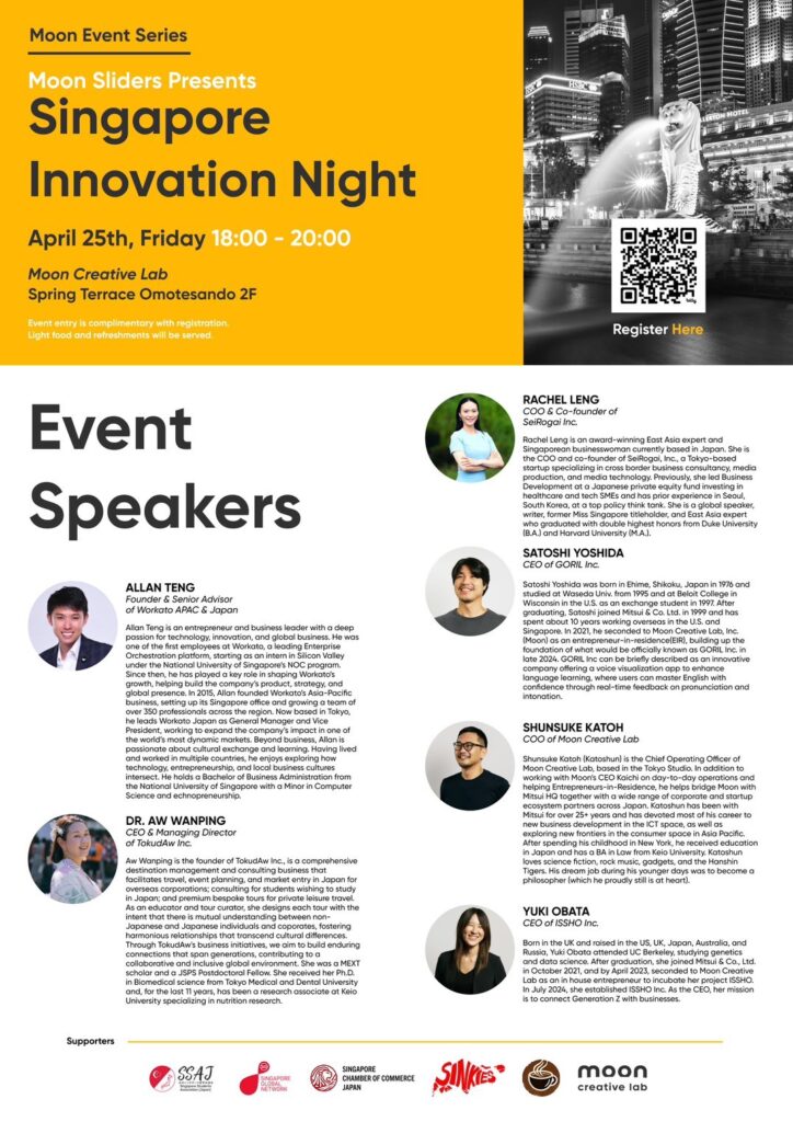 2025年4月5日に開催された「Singapore Innovation Night」において、リン・レイチェルは、シンガポールの起業家、ビジネスパーソン、学生を対象に、インスピレーショナルな洞察を共有しました。本イベントは、Moon Creative Labと在日シンガポール学生協会(SSAJ)の共催で実施されました。